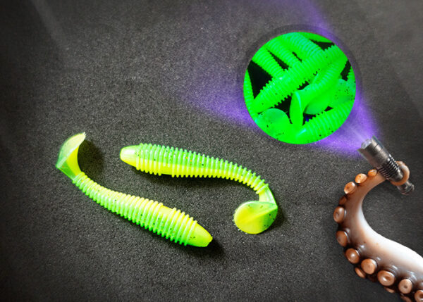 Ein wunderbarer Barschköder mit starker Riffelung, bereits leicht geflavourt, je nach Farbe UV aktiv. Kommt mit einer mittelweichen Gummimischung und