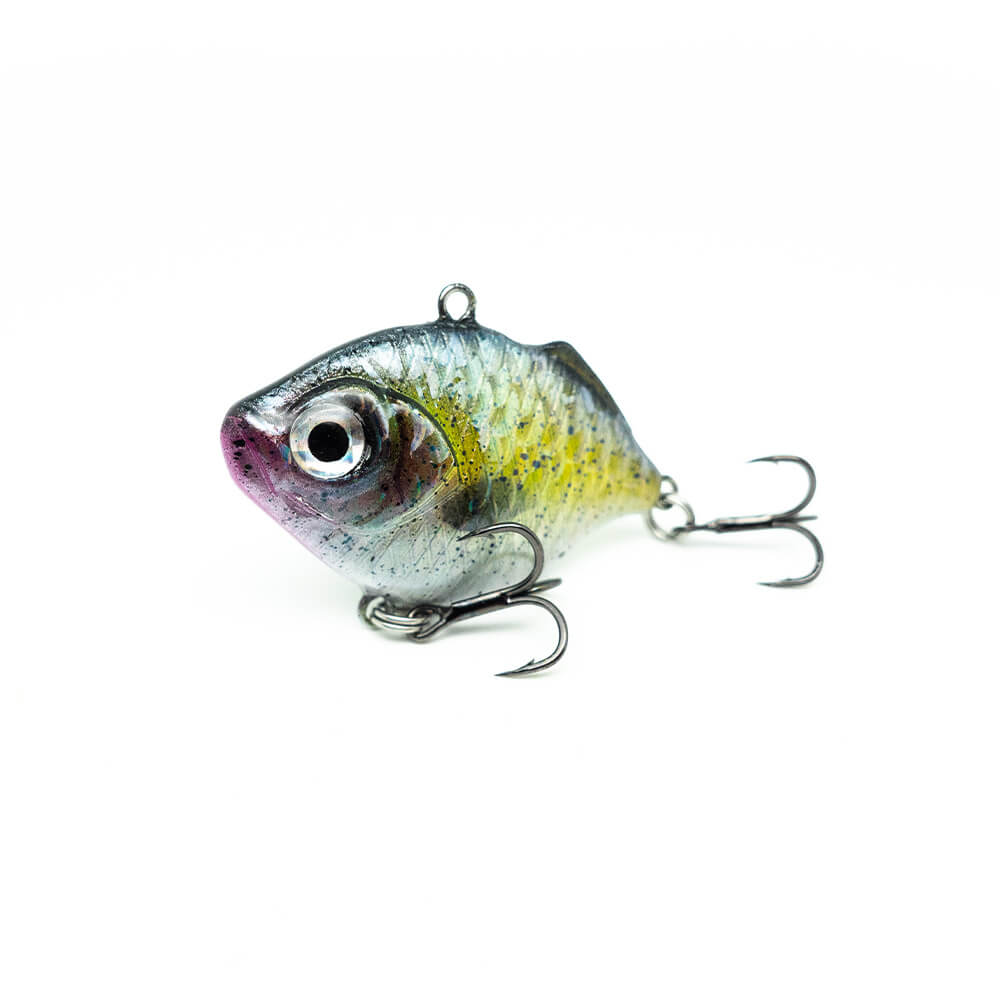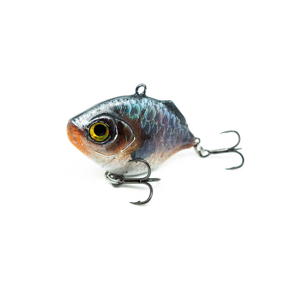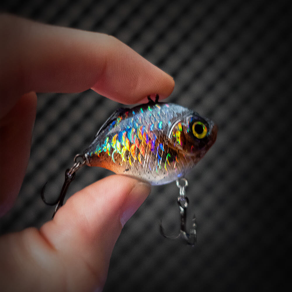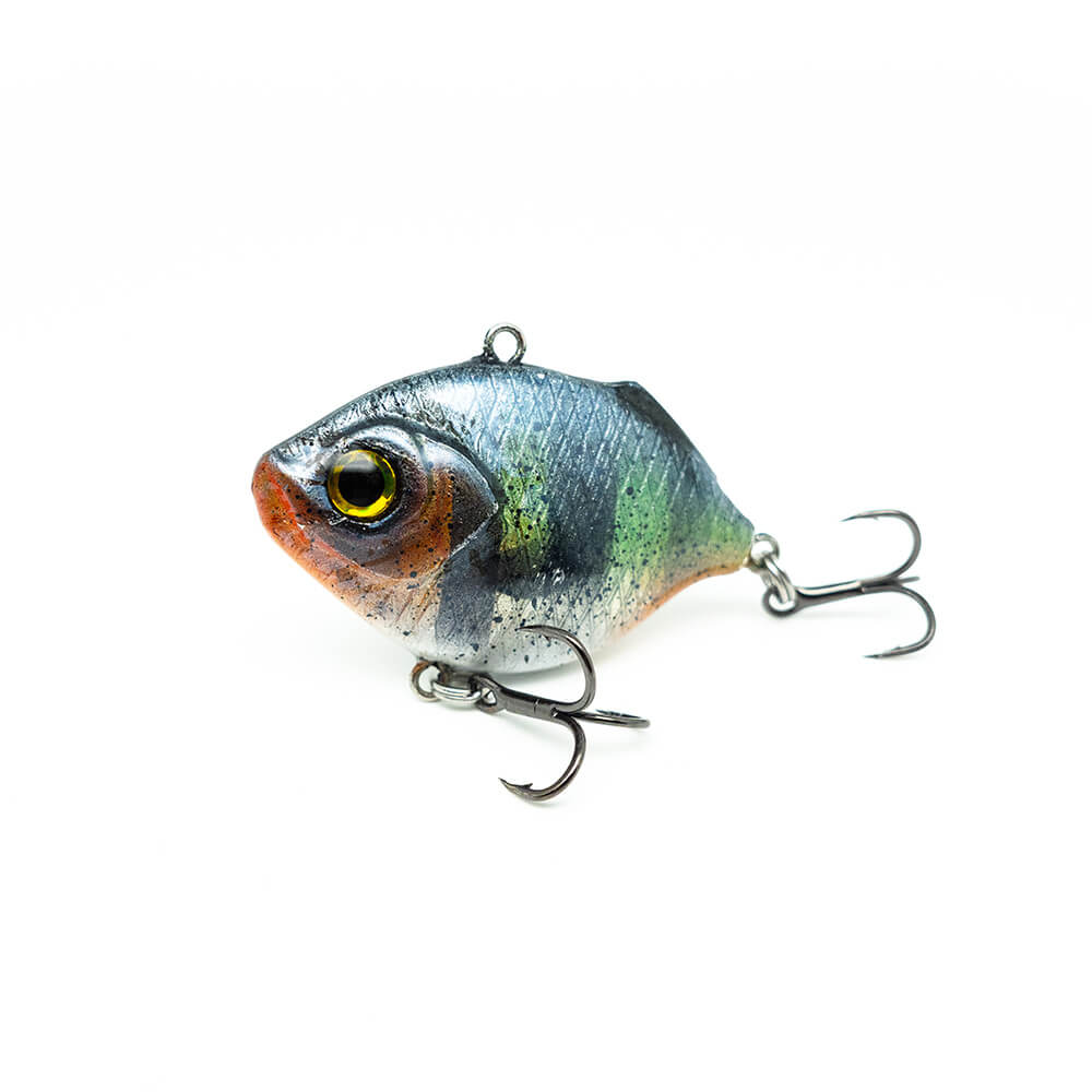 Die Köder sinken zügig ab und haben ein recht lautes Rasselgeräsuch. Du wirst diesen Köder deutlich im Handgelenk spüren, da er sich, typisch für Vibration Baits, stark schüttelt beim Lauf. Da sich Sonnenbarsche, besonders im Frühjahr und Sommer, gerne am Uferrand aufhalten, präsentierst du diesen Köder am besten Ufernah, entlang von Schilf- und Unterwasser-kanten. Dei dunkelsten Dekore, haben den stärksten Holo-Schuppen-Effekt.