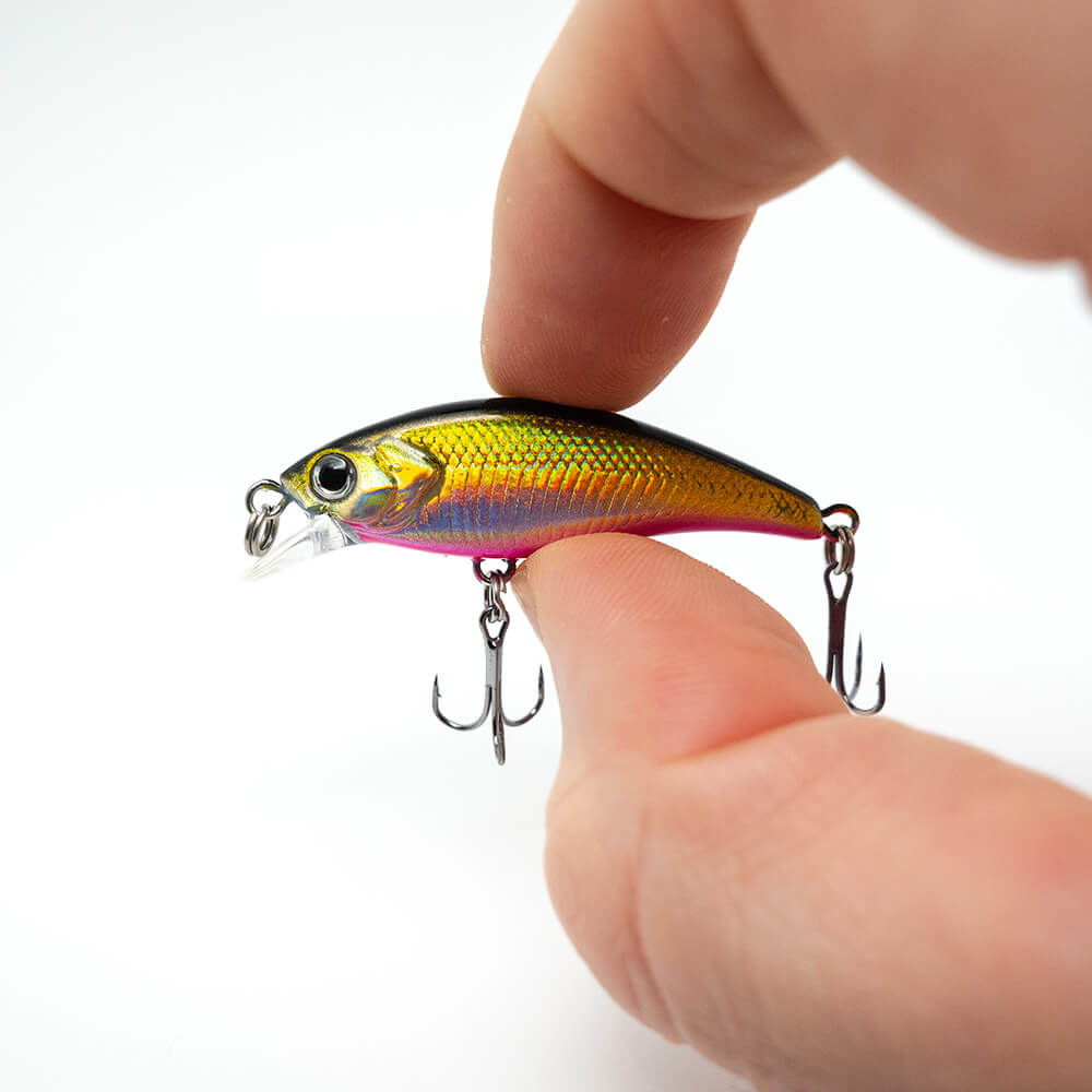 Dieser kleine Wobbler lässt sich dank guter Gewichtsverlagerung auf ausgezeichnete Wurfweiten bringen. Dank dem sehr flachen Seitenprofil flankt der Köder stark und präsentiert dabei seine irisierende und teilweise UV aktive Hautoberfläche (Regenbogen-Effekt) im Sonnenlicht. Top Köder vor allem auch zum lebhaften antwitchen, jerken und zupfen.